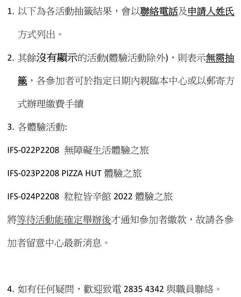 由於疫情回穩, 本單位服務恢復如常, 歡迎各中籤者由即日起至2022年5月25日(星期三)辦公時間內親臨完成繳費及報名手續。